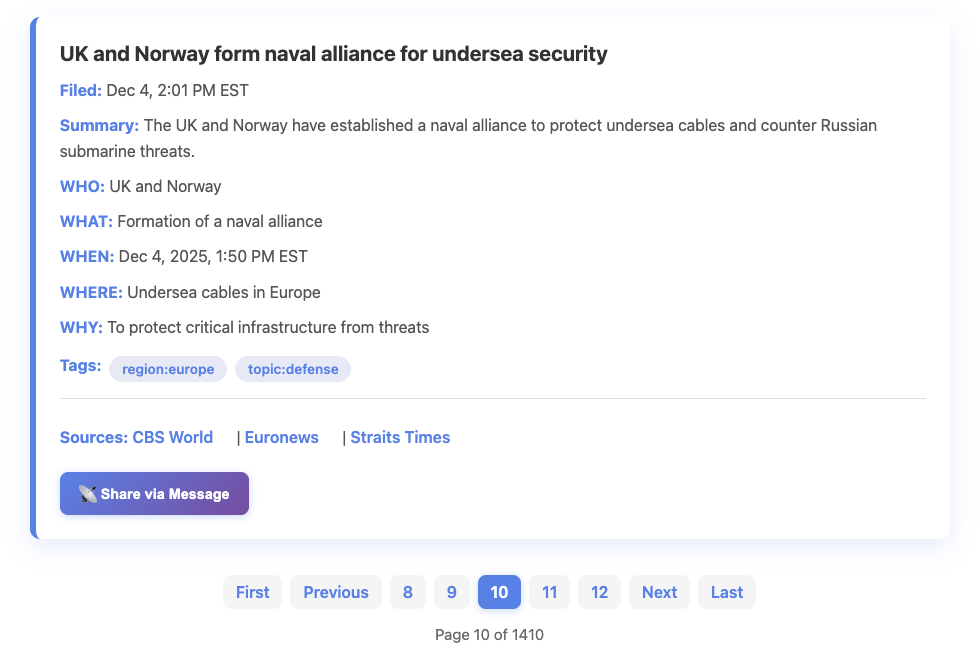 - AI-Driven Aggregation: Over 77 mainstream U.S. and international news outlets deduplicated, clustered, and summarized.
