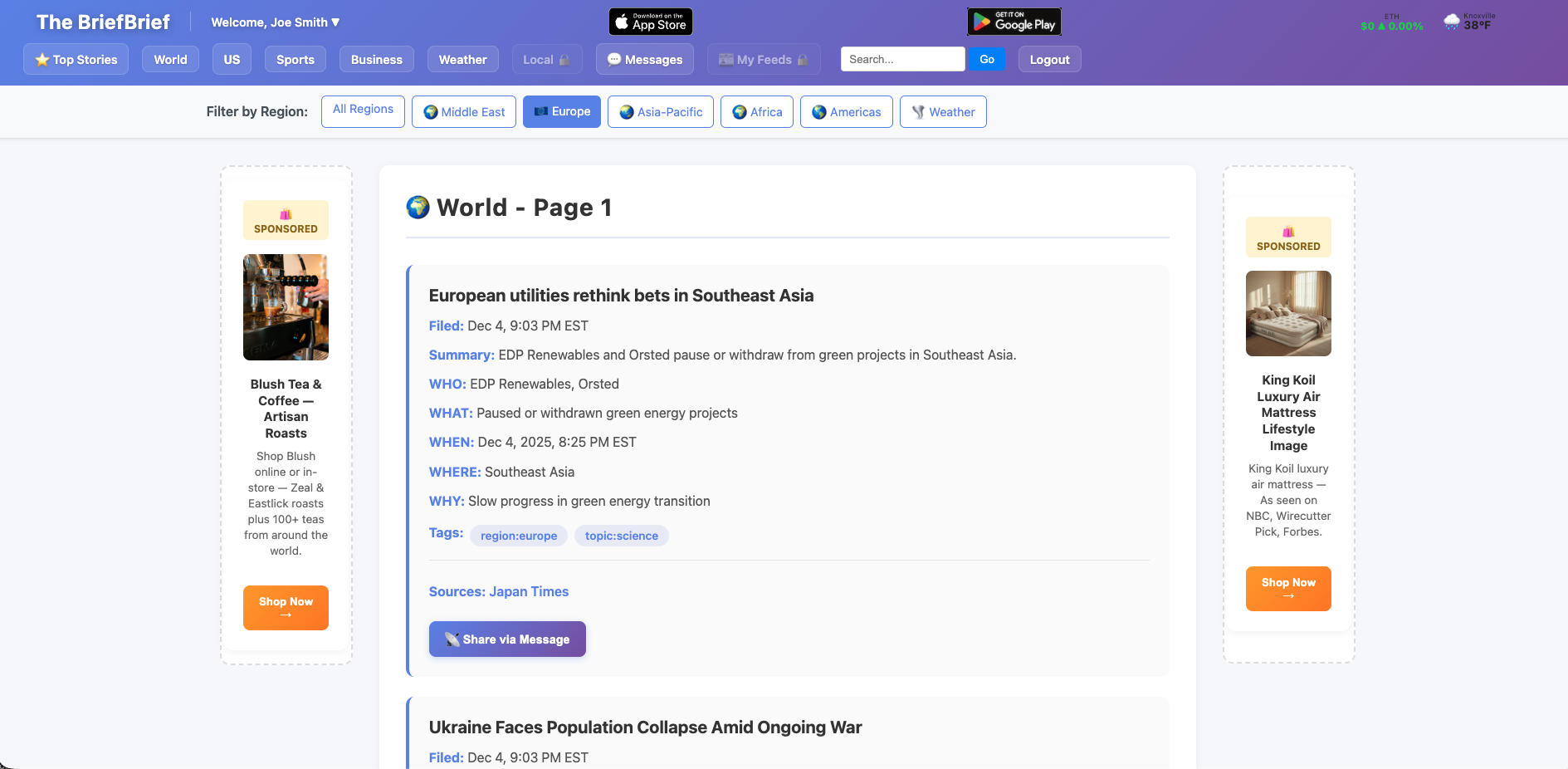 Available at https://thebriefbrief.news, and on the Apple App Store and Google Play, the platform aggregates global, U.S., business, sports, local, and weather updates from more than 77 mainstream U.S. and international news outlets. Each story is summarized using "Who, What, When, Where, Why," giving users only essential information — without editorializing or emotional framing.